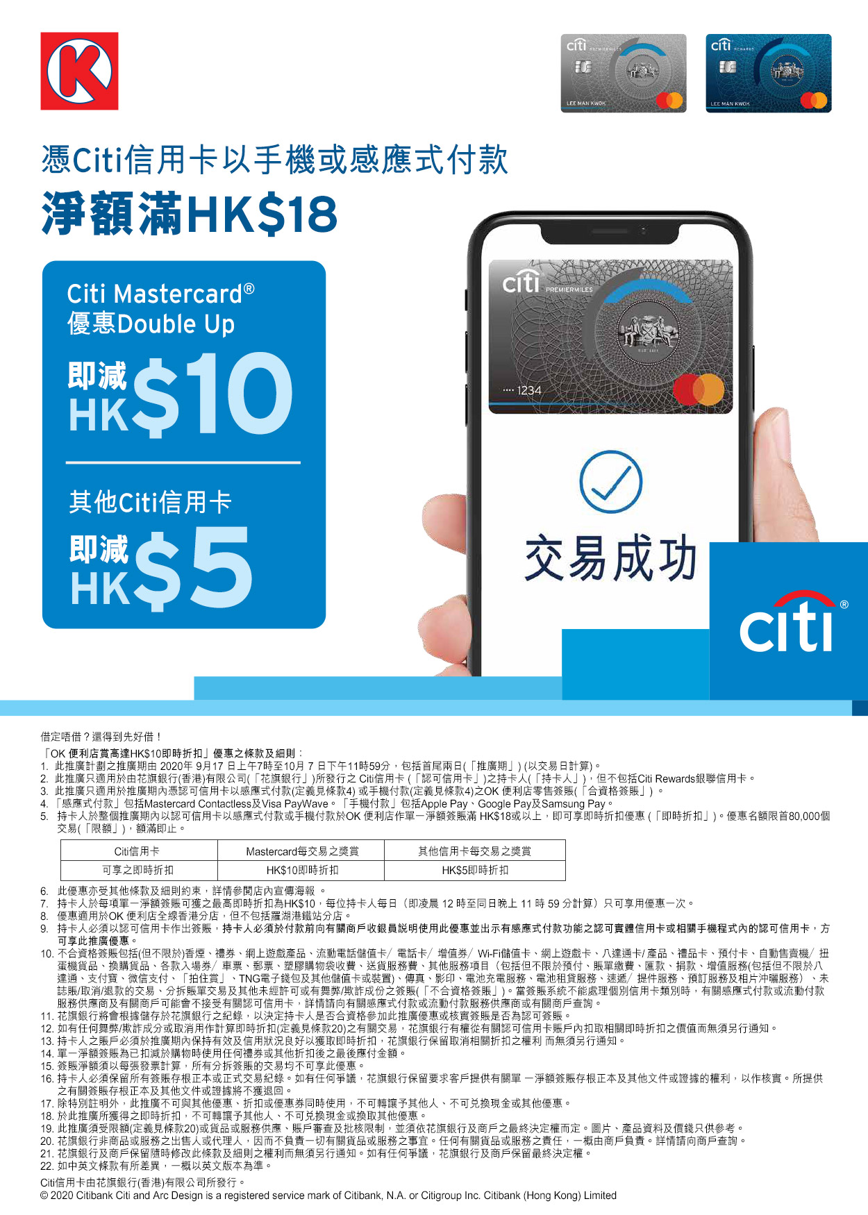 「依家去OK便利店買嘢有雙重著數!喺手機付款內綁定Citi信用卡或者用感應式付款即享獨家折扣!」