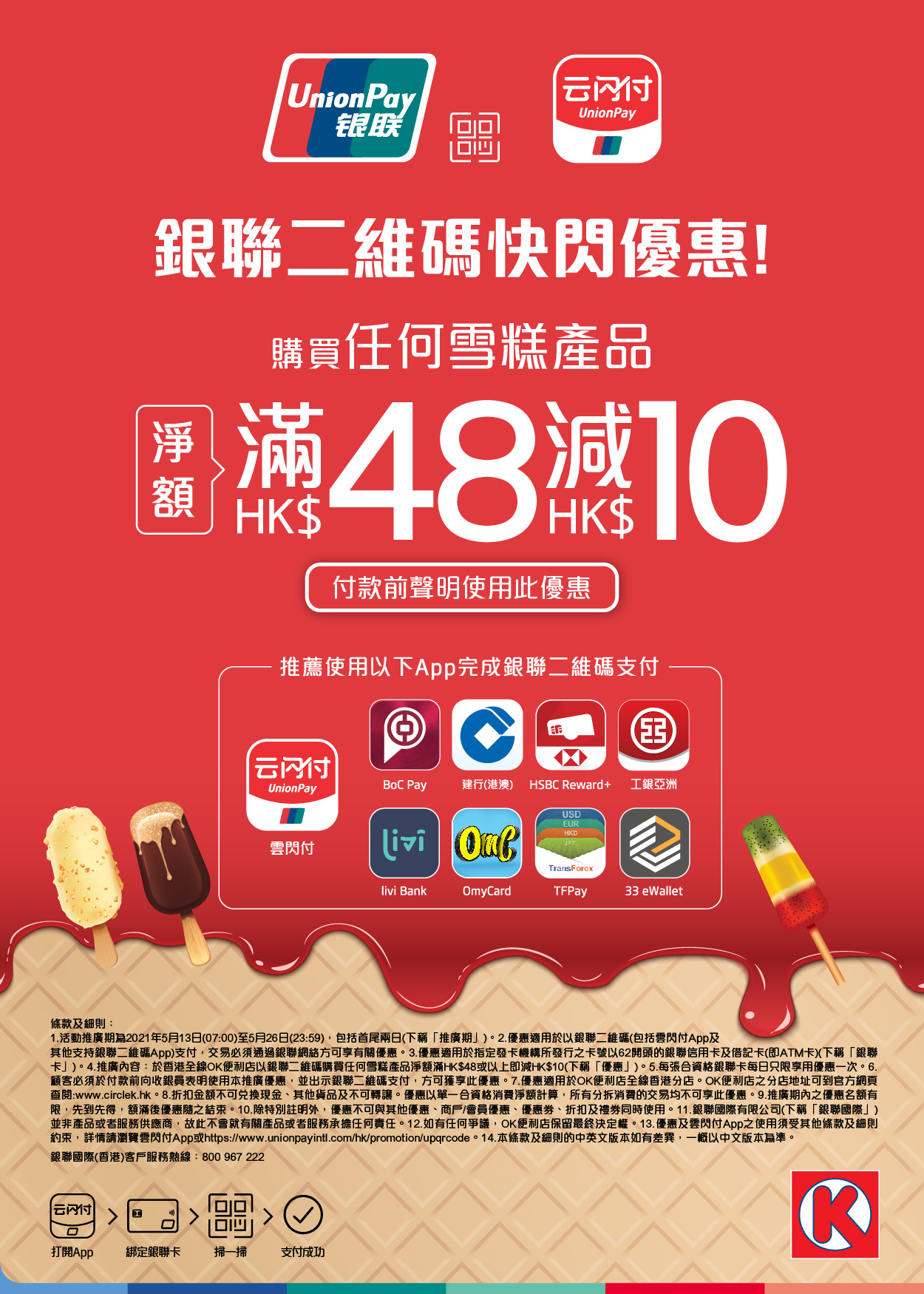 最後,使用云閃付或是銀聯二維碼付款,今日內到Circle K買雪糕產品消費滿$48就可即減$10的優惠。